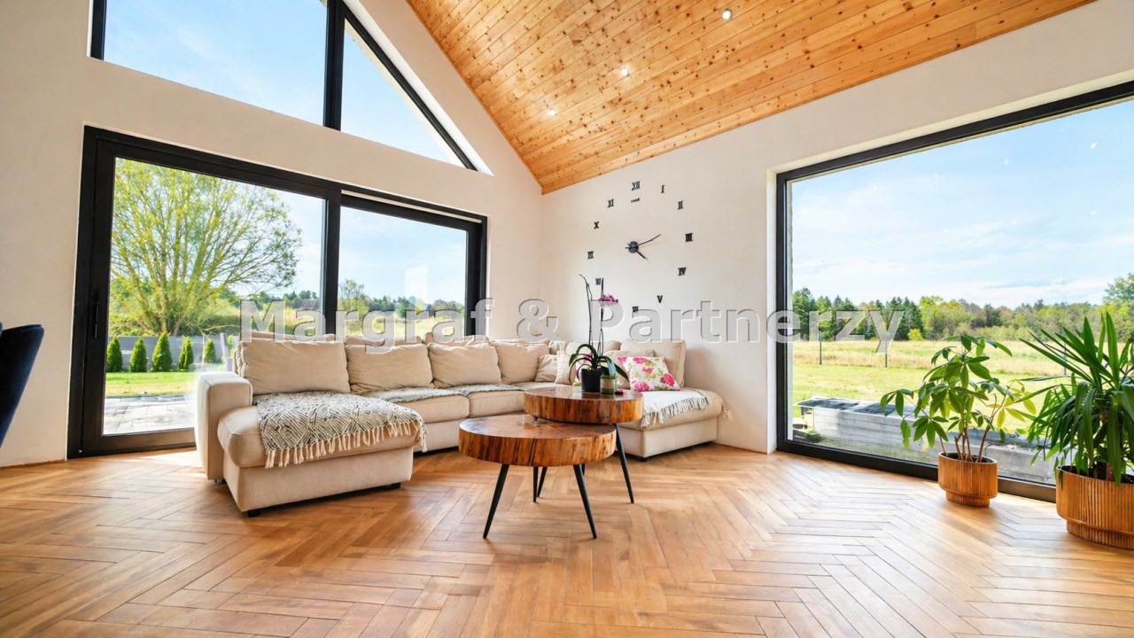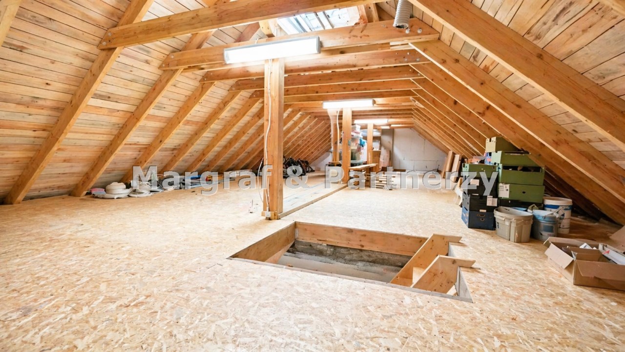 Ale ten dom skrywa jeszcze jedną możliwość — wystarczy spojrzeć wyżej. Nad częścią mieszkalną rozciąga się ponad 100 metrów poddasza, które czeka na własną historię. Może stanie się miejscem pracy, prywatną strefą relaksu, a może dodatkowymi pokojami dla bliskich. To przestrzeń, która daje wybór.