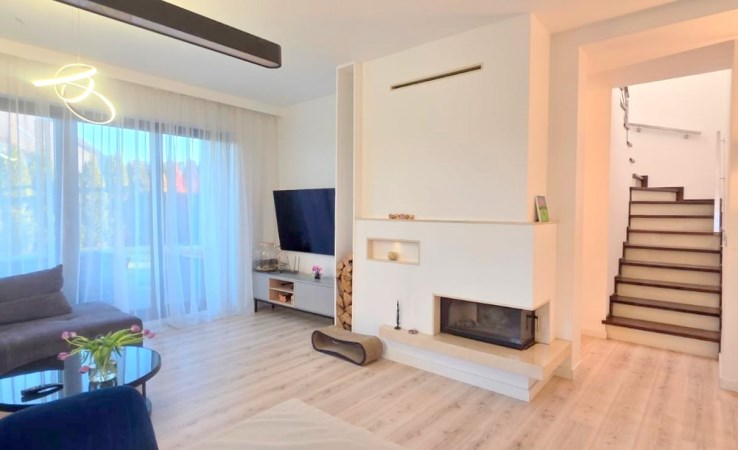 Wieczorem dom znów skupia się wokół salonu. Ogień w kominku odbija się w wysokiej przestrzeni, tworząc atmosferę, której nie da się podrobić. Cisza wraca, a wraz z nią poczucie, że to miejsce naprawdę odcina od świata, ale nie od wygody.