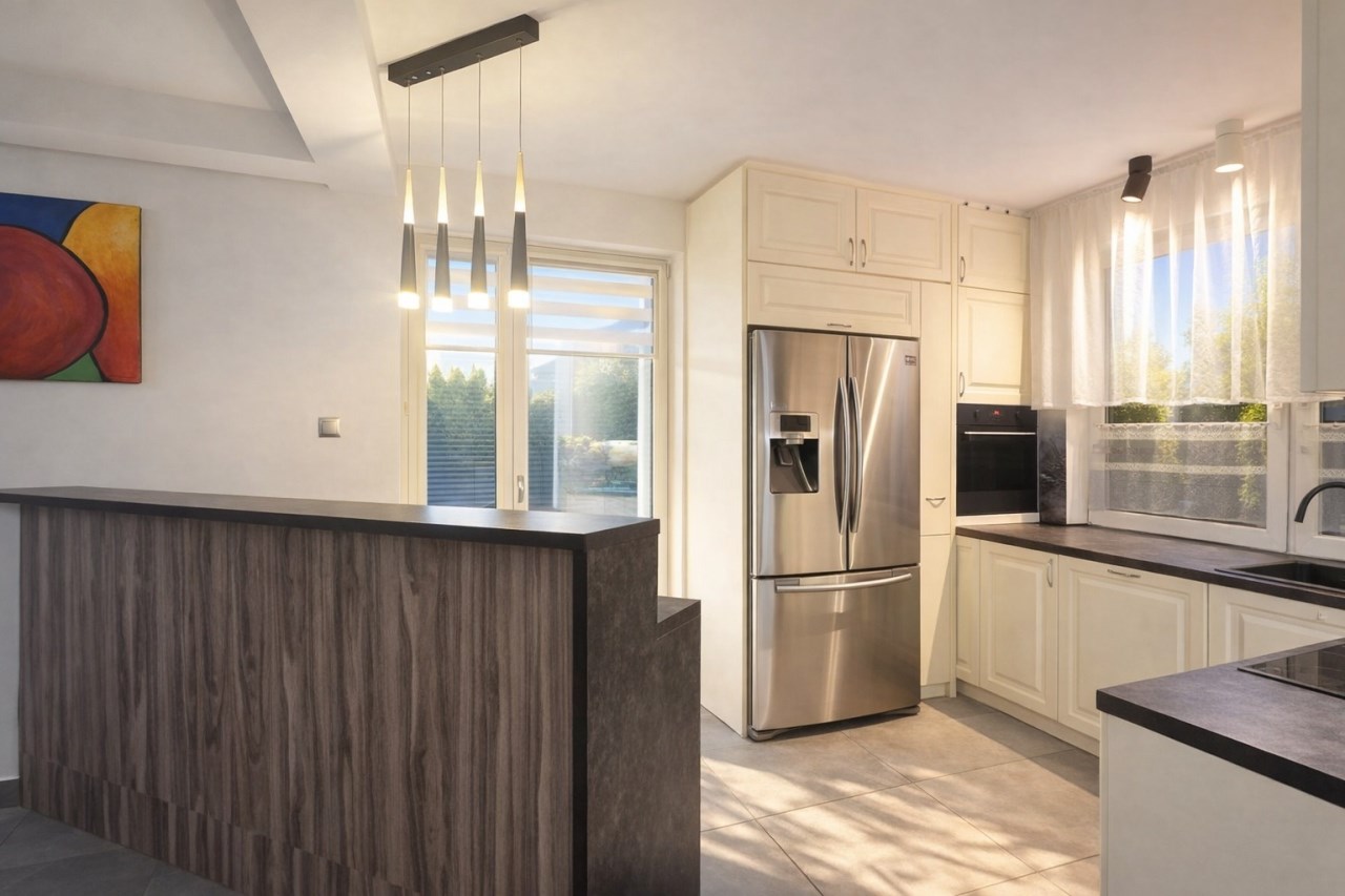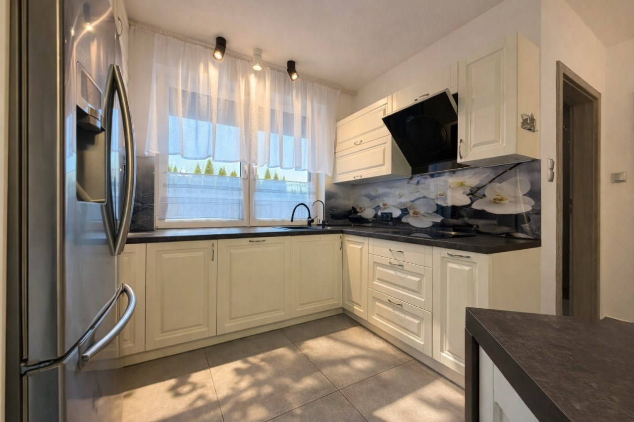 Kuchnia wykonana w zabudowie na wymiar, wyposażona w płytę indukcyjną, piekarnik elektryczny, okap, zmywarkę oraz lodówko-zamrażarkę z bezpośrednim podłączeniem do wody i kostkarką. Dodatkowo zamontowany filtr wody.