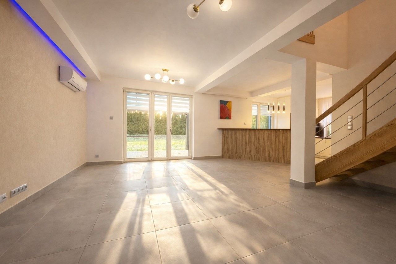 Salon jest przestronny, ustawny i doskonale doświetlony. Znajduje się w nim kominek z wkładem akumulacyjnym, który efektywnie oddaje ciepło jeszcze długo po wygaszeniu ognia, oraz jednostka klimatyzacji. Z salonu wyjście prowadzi na taras o powierzchni 21 m² oraz do ogrodu. Dużym atutem jest zadaszona pergola z elektrycznymi roletami, tworząca komfortową strefę wypoczynkową niezależnie od pogody.