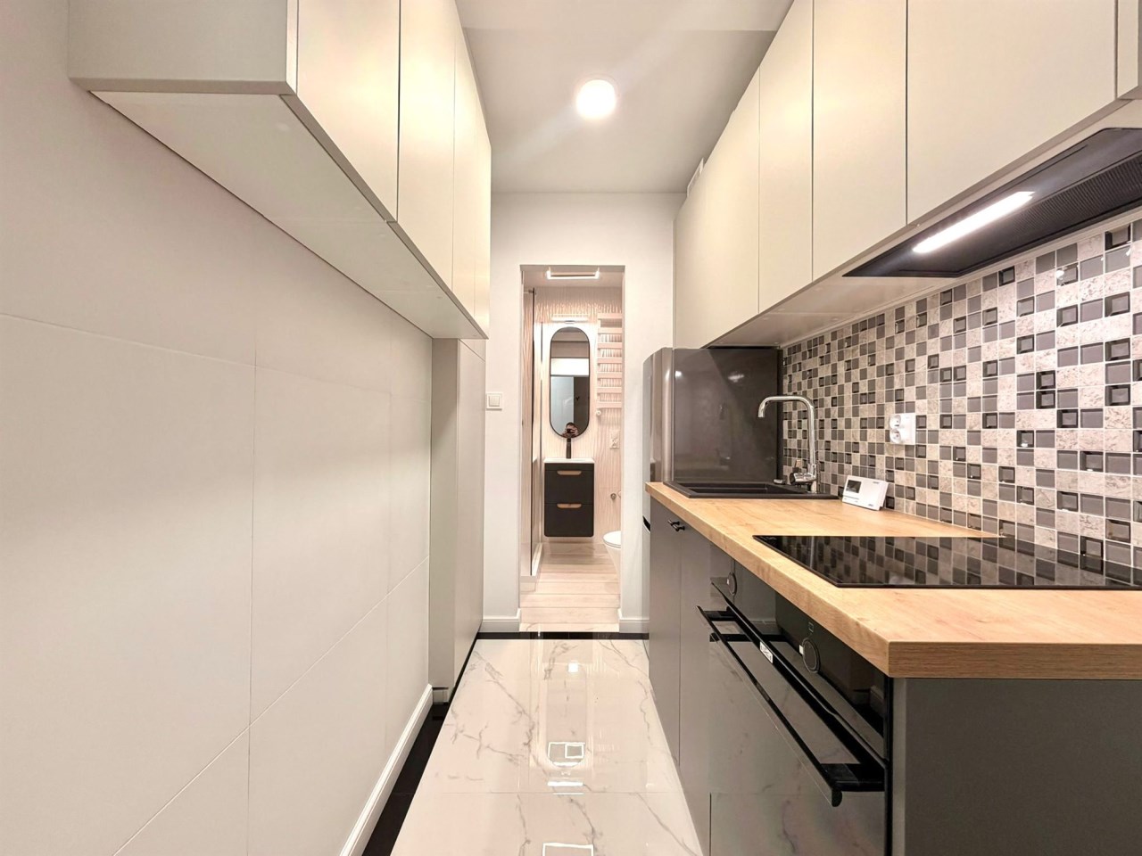 Wnętrze zostało zaprojektowane w nowoczesnym, minimalistycznym stylu z eleganckimi akcentami. Jasna kolorystyka optycznie powiększa przestrzeń, a wysokiej jakości materiały wykończeniowe podkreślają klasę nieruchomości. Zabudowa kuchenna wykonana na wymiar, połyskujące fronty, drewniany blat oraz starannie dobrane detale tworzą efekt premium. To mieszkanie, które realnie wyróżnia się standardem na tle konkurencji.
