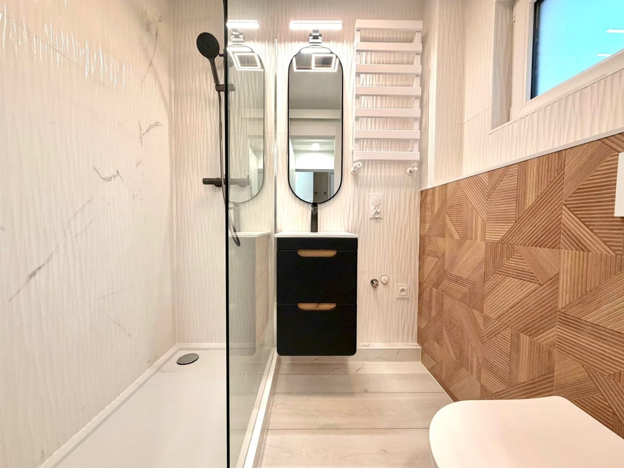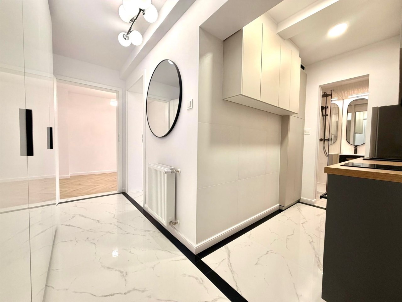 Wnętrze zostało zaprojektowane w nowoczesnym, minimalistycznym stylu z eleganckimi akcentami. Jasna kolorystyka optycznie powiększa przestrzeń, a wysokiej jakości materiały wykończeniowe podkreślają klasę nieruchomości. Zabudowa kuchenna wykonana na wymiar, połyskujące fronty, drewniany blat oraz starannie dobrane detale tworzą efekt premium. To mieszkanie, które realnie wyróżnia się standardem na tle konkurencji.